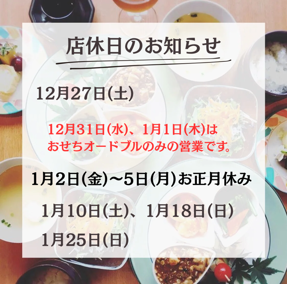 12月28日(日)~1月1日(木)の期間、通常オードブル、単品のテイクアウトの受付を中止しております。